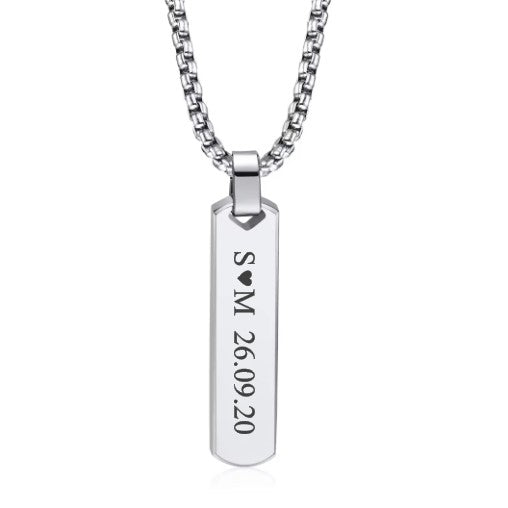 Lleva contigo un recuerdo inolvidable con este sofisticado collar personalizado de barra vertical en acero inoxidable plateado. Perfecto para grabar iniciales, fechas especiales o mensajes cortos que marquen momentos únicos en tu vida.