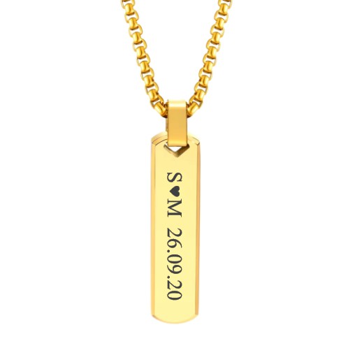 Lleva contigo un recuerdo inolvidable con este sofisticado collar personalizado de barra vertical en acero inoxidable dorado. Perfecto para grabar iniciales, fechas especiales o mensajes cortos que marquen momentos únicos en tu vida.