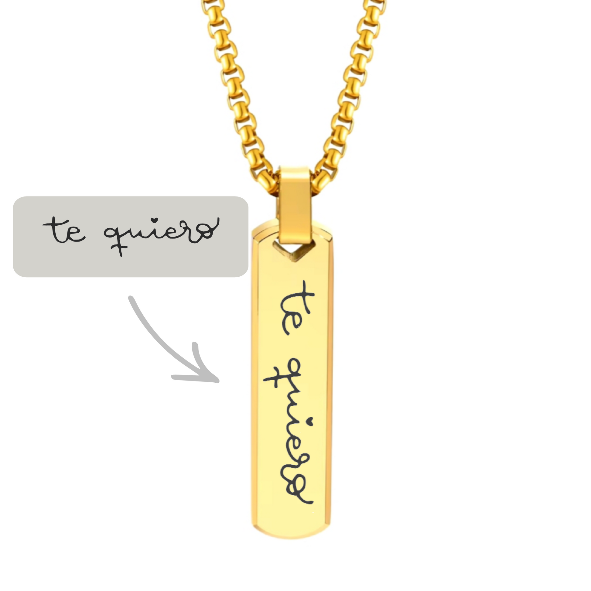 Lleva tus palabras más especiales siempre contigo con este elegante colgante de barra dorada. Personalízalo con un mensaje único escrito a mano, para capturar recuerdos, nombres o frases que significan mucho para ti.