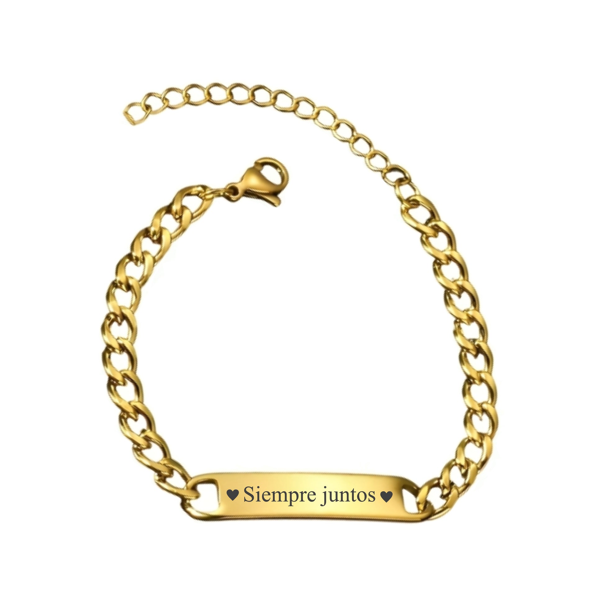 Agrega un toque especial y único a tu estilo con esta esclava de acero inoxidable en color dorado. Su diseño elegante y atemporal incluye una placa personalizable en la que puedes grabar un mensaje especial, iniciales o una fecha significativa. Perfecta para regalar o para ti mismo.